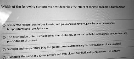Solved Which Of The Following Statements Best Describes The Effect Cllmate On Biome Distrbution Forests And Grasslands Have Cuchly The Umc Annud Temperate Forests Conifercus Temperatures And Precipitaticn Strangly Correlated With The Mean