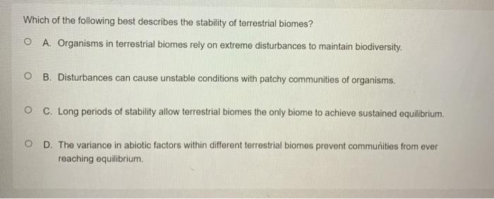 I would chose the 4th one because biome is made up of a bunch of little biospheres Send. There are two types of grasslands. They have migrated to biomes that suit their biological needs.
